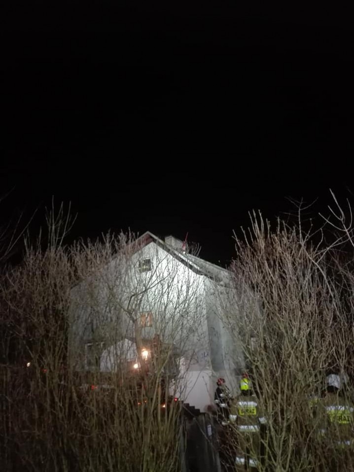 Paliła się podbitka drewniana nad wejściem do budynku mieszkalnego jednorodzinnego na wysokości około 7 metrów od strony szczytu. Wewnątrz budynku nie doszło do pożaru. Na szczęście nikt nie został poszkodowany, właściciel domu znajdował się na zewnątrz. Przewód kominowy oddalony był 2,5m od palącej się podbitki. Służby zabezpieczyły miejsca zdarzenia, następnie ugaszono palące się poszycie. Po ugaszeniu pożaru sprawdzono kamerą termowizyjną dach w celu wykluczenia zarzewi ognia.