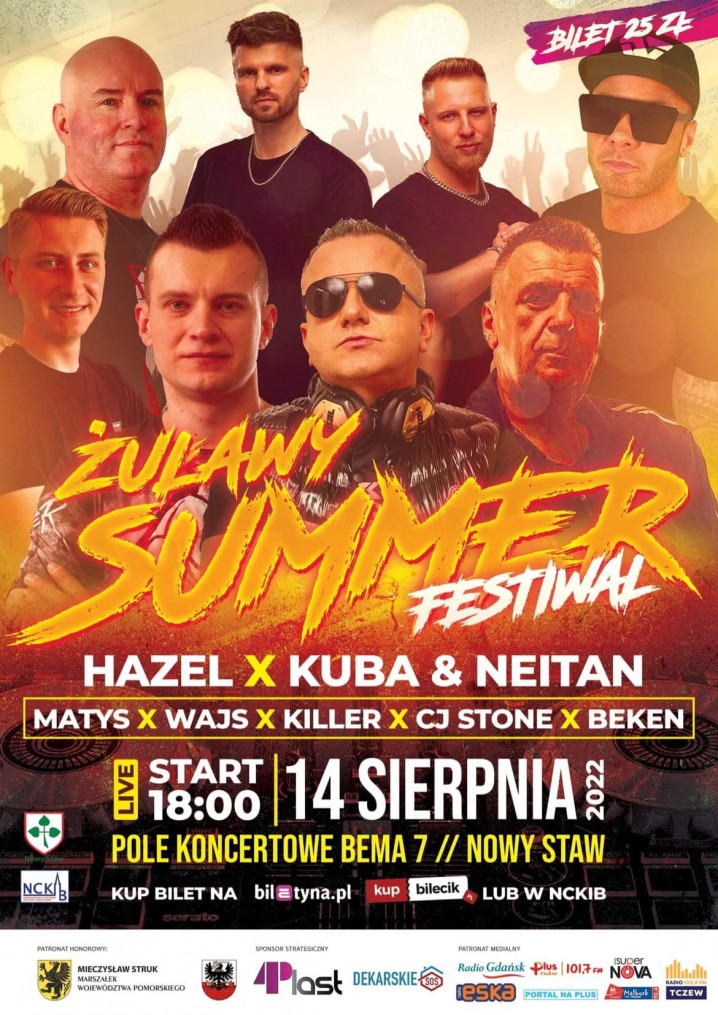 Już 14 sierpnia br. na polu koncertowym w Nowym Stawie od godz. 18.00 rozpocznie się największa letnia impreza plenerowa w naszym regionie – Żuławy Summer Festiwal. Na scenie zagrają takie gwiazdy sceny klubowej, jak Hazel, Kuba&Neitan, Matys, Wajs, Killer, CJ Stone i Beken.